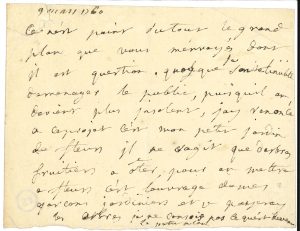 [9 mars 1760] ; 1 page oblong in-12 (petite déchirure réparée à un coin). Sur l’aménagement de son jardin. « Ce n’est point du tout le grand plan que vous m’envoyés dont il est question. Quoy que je sente l’inutilité de menager le public, puisquil en devient plus insolent, jay renoncé a ce projet c’est mon petit jardin de fleurs il ne sagit que darbres fruitiers a ôter, pour en mettre a fleurs c’est l’ouvrage de mes garçons jardiniers et je payeray les arbres je ne consois pas ce qu’est devenu le petit plan ». Ancienne collection Victor Sanson (cachet).