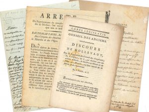 Affiches : Loi relative à la fabrication de la monnoie provenant du métal des Cloches, et un Règlement de l’état-major de la place de Huningue (bilingue). Commission d’apothicaire aide-major de l’hôpital ambulant de l’Armée des Pyrénées. Arrêté du représentant du Peuple Faure relatif aux cultes (impr. signé lui avec cachet cire). Discours de Mollevaut aux Cinq-Cents qui déclare que les armées d’Italie, de Sambre-et-Meuse et de Rhin-et-Moselle ont bien mérité de la patrie et de l’humanité. Correspondance administrative ; pétition ; certificat de service militaire... P.S. ou L.S.par J.L. d’Arbois de Jubainville, Ch. Boilleau, P.F.D. Bonnet, général Gabriel Clément, Balthazar Faure, Ed. Poncet… On joint un manuscrit sur Verdun, Chartre ou Loix de la cité de Verdun, [début XIXe siècle] ; cahier petit in-4 de 22 pages. « Accord ou Paix faite entre Loys de Bar, Cardinal, 75e évêque de Verdun le 20 mai 1426 et les Citoiens de Verdun », copie du « Règlement pour la justice et police », sur le port d’armes, les prisonniers, les « Wardeurs de la paix », les « penniez » (gages, réquisitions, exactions), etc.