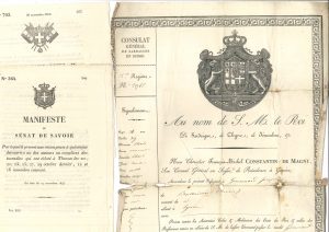 Manifeste du Sénat de Savoie (1845), ordonnance impr. de Victor-Emmanuel II sur la Bourse de Turin (1850) ; passeport pour aller de Ballaison à Lyon (1834, répar.) ; lettres et pièces envoyées à l’intendant général de Chambéry, circulaires du gouverneur général ou de l’intendant général aux syndics du duché, circulaires du préfet aux maires ; etc.