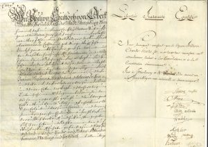 9 actes d’achat de maisons (1579-1767). Procès-verbal de l’adoption de la Constitution signé par le président Ludwig Heinrich Hecht et le bureau de l’assemblée du canton de la 5e section de Strasbourg (en-tête Departement des Nieder-Rheins). Certificat de civisme révolutionnaire pour Frédéric Charles Hecht fils (1794). Poème, Le dernier Cri de la Garde impériale.