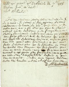 Paris 8 juin 1773, à Alexis-François-Joseph de Gourgues ; 2 pages in-4. C’est avec regret, « et à la suite de vostre perseverance à vous demettre de l’intendance de Montauban que je proposay hyer au Roy [Louis XV] d’agreer vostre demission. Sa Maj. à laquelle je rendis compte en même temps du bien que vous avez fait dans cette generalité pendant vostre administration m’a chargé de vous temoigner la satisfaction qu’elle avoit de vos services. […] le Roy a bien voulu sur ma demande vous donner Mr Terray maître des requetes mon neveu pour successeur. Je vous supplie de l’aider de vos conseils et de vos connoissances »... On joint une L.S. de Victor de Riquetti, marquis de Mirabeau père, à une dame, reconnaissant une dette (Paris 24 septembre 1785).