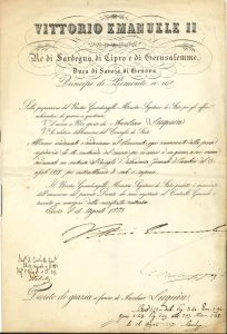 Polenzo 14 août 1853 ; 1 page grand in-fol. en partie impr., en-tête Vittorio Emanuele II, grand sceau aux armes sous papier, avec supplique jointe par une cordelette bleue et sceau cire rouge ; en italien. Décret de grâce en faveur d’Anselme Luquin, Nantais condamné par le Conseil d’Intendance de Chambéry pour contravention aux lois sur les douanes et gabelles. On a lié au décret la supplique de l’avocat du condamné, et joint 3 documents en français ou italien. On joint une L.S. d’Emmanuel Arago, Berne 9 octobre 1884, à Jules Ferry (3 p. in-8, en-tête Ambassade de France en Suisse).