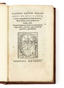 Claude GALIEN - 0131? - 0201? — De compositione medicamentorum secundum locos — Venise, Lucaeantonii Juntae, 1536 — In-8 (18,5 x 11,6 cm), [24] f., 207 p. et [1] f. (+8, ++8, +++8, A-Z8, AACC8), basane brun-rouge, dos à nerfs (Birmingham...