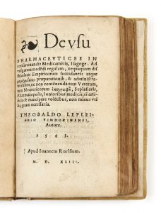 Thibault LESPLEIGNEY - 1496 - 1550 — De Usu pharmaceutices — S.l., I. Ruellium, 1543 — In-16 (11,6 x 7,5 cm), 229 p., [5] f. (A-P8), parchemin beige, dos lisse, tranches dorées (reliure du XXe siècle).