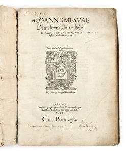 Seconde édition de la traduction latine par Jacques Dubois du traité en trois livres De re medica du médecin arabe chrétien, dit Jean Mésué et première édition du traité écrit par Jacques Dubois.