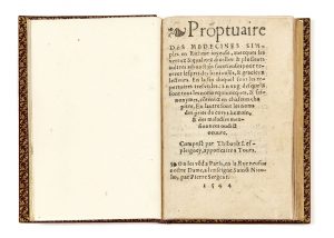 Thibault LESPLEIGNEY - 1496 - 1550 — Promptuaire des médecines simples — Paris, Pierre Sergent, 1544 — In-8 (12,5 x 8,2 cm), [80] f. (AK8), maroquin bordeaux, contreplats à bordure de même peau ornée de dentelle dorée, dos à nerfs,...