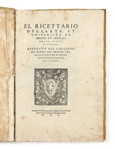 Édition du XVIe siècle du Ricettario florentin, imprimée sous l’égide des Médicis dont les armes sont gravées au titre et ornée de lettrines également gravées sur bois.
