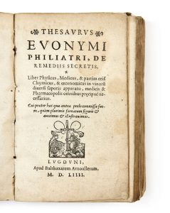 Conrad GESNER - 1516 - 1565 — Thesaurus Euonymi Philiatri de remediis secretis — Lyon, Balthazarem Arnoulletum, 1554 — In-16 (12,4 x 7,7 cm), [24] f., 499 p. et [4] f. (aa-cc8, a-z8, A-I8), vélin souple ivoire à lacets, dos à nerfs apparents...