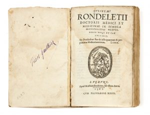 Guillaume RONDELET - 1507 - 1566 — De ponderibus, sive de Justa quantitate & proportione medicamentorum, liber — Lyon, Matthias Bonhomme, 1560 — In-8 (15,6 x 10,5 cm), [12] f., 168 p., 26 p. et [3] f. (A8, B4, A-K8, L4, M-N8), parchemin souple...