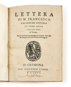 Francesco CALZOLARI - 1522 - 1609 — Lettera di M. Francesco Calceolari spetiale al segno della campagna d’oro in Verona. — Crémone, Vincenzo Conti, 1566 — In-4 (19 x 13,4 cm), [20] f. (A-E4), vélin souple ivoire, dos à nerfs apparents...