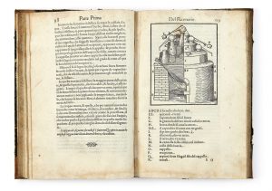 Édition du XVIe siècle du Ricettario florentin, comprenant une page de titre probablement supplémentaire, ornée d’un titre-frontispice architecturé gravé à l’eau-forte ainsi que des lettrines et de la marque de l’imprimeur gravées sur bois.