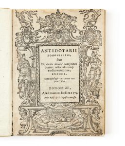 Ulisse ALDROVANDI - 1522 - 1605 — Antidotarii bononiensis — Bologne, J. Rossium, 1574 — In-8 (19,5 x 14,4 cm), [8] f., 492 p. et [10] f. (*8, A-Z8, AA-II8) vélin souple ivoire à petits rabats, dos à tranchefiles à passe (reliure du XXe...