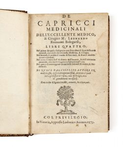 Leonardo FIORAVANTI - 1517 - 1588 — De capricci medicinali — Venise, Lodovico Avanzo, 1573 — In-8 (14,2 x 9,7 cm), [11] f., 297 f. et [13] f. (a8, b8, A-Z8, Oo4, b4-8, c7), veau glacé brun, plats à encadrement de triple filet doré,...
