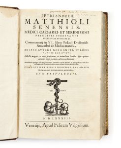 Pierandrea MATTIOLI - 1500 - 1577 — Commentarii in VI libros Pedacii Dioscoridis Anarzabei de medica materia Venise, F. Valgrisium, 1583 — Grand in-8 (34,1 x 21 cm), [70] f., 583 p., 772 p., [6] f. (a10, b8, c6, d6, e-i8, A-Z8, Aa-Ll8, Mm-Nn10,...