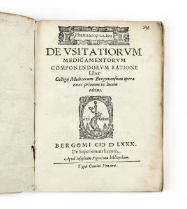 Première édition de cette pharmacopée de Bergame, ornée de jolies lettrines et d’une marque de l’imprimeur reprenant l’ancre aldine, gravées en taille-douce.