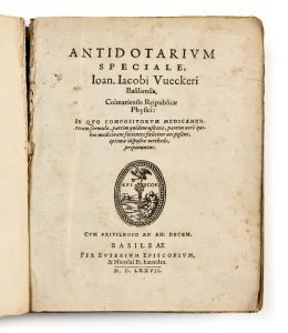 Première édition selon Durling de l’Antidotarium speciale comportant deux marques de l’imprimeur, gravée sur bois.