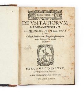 Première édition de cette pharmacopée de Bergame, ornée de jolies lettrines et d’une marque de l’imprimeur reprenant l’ancre aldine, gravées en taille-douce, dans sa reliure d’époque et comprenant le feuillet d’errata ajouté au dernier cahier.
