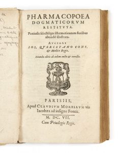 Joseph DU CHESNE, Sieur de la Violette - 1544 - 1609 — Pharmacopoea dogmaticorum restituta — Paris, Claude Morel, 1607 — In-8 (17,2 x 11 cm), [4] f., 619 p. (en réalité, 621 p.), [13] f. (.4, A-Z8, Aa-Rr8, Ss4), vélin souple ivoire, dos à...