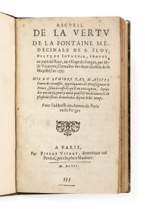Pierre de GROUSSET ? — Recueil de la vertu de la fontaine médicinale de St.-Eloi, dite de Jouvence — Paris, Pierre Vitray, 1607 — In-4 (15,9 x 10 cm), [2] f., 33 p., [1] f. ([A]-E4), bradel de demi-maroquin vert (E. Carayon).