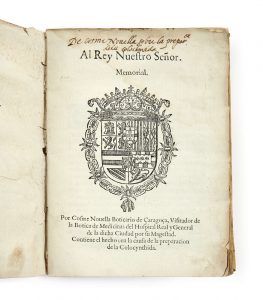 Première édition de ce mémoire de Novella à propos de la coloquinte adressé au roi d’Espagne Philippe III et reproduisant des lettres de celui-ci principalement adressées au médecin Gabriel de Sora.