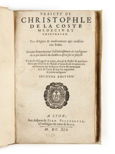 Christoval ACOSTA - 1525? - 1593? — Des drogues & des médicamens qui naissent aux Indes — Lyon, Jean Pillehotte, 1619 — In-8 (16,5 x 10,2 cm), 176 p. et [4] f. (AA-LL8, MM4), parchemin ivoire à petits rabats, dos à tranchefiles à passe...