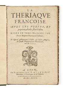 Pierre MAGINET - XVIIe siècle — La Thériaque françoise — Lyon, Barthélémy Vincent, 1623 — Petit in-4 (16,7 x 11 cm), 90 p. et [1] f. (A-L4, M2), bradel demi-percaline verte (reliure du XXe siècle).