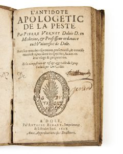 Pierre VERNEY - XVe - XVIe siècle. — L’antidote apologetic de la peste Dole, Antoine Binart, 1629 — In-8 (15,1 x 9,2 cm), [8] f. 174 p. (.8, A-K8, L7), vélin ivoire, dos à tranchefiles à passe, tranches mouchetées bleues (reliure de...