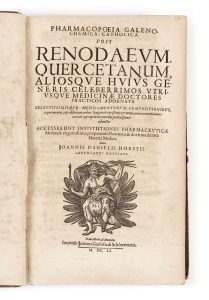 Johann Daniel HORSTIUS - 1616 - 1685 — Pharmacopoeia Galeno-Chemica — Francfort, Joannis Godofredi Schônwetteri, 1651 — In-folio (34,4 x 20,5 cm), 4 f., CCLXIII (en réalité, CCLIX), 10 p., [1] f., 614 p., [11] f. (4 f., a-x6, y4, ¶6, A-Z6,...