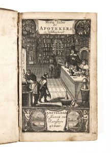 Première édition de ce traité néerlandais qui connaîtra plusieurs rééditions, ornée d’un titrefrontispice ajouté, représentant une boutique d’apothicaire, gravé à l’eauforte, quelques bois gravés in-texte.