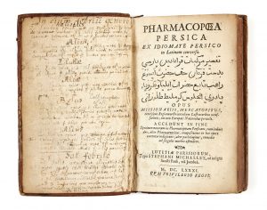 Première édition, selon Krivatsy, de cette traduction du perse au latin de ce traité, orné des armes de la Compagnie de Jésus, bandeaux, culs-delampe et caractères arabes gravés sur bois.