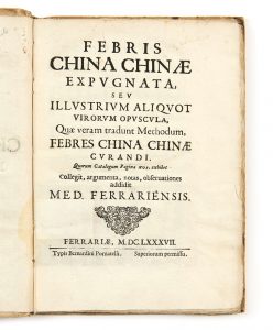 Francesco Maria NIGRISOLI - 1648 - 1727 — Febris china chinae expugnata — Ferrare, Bernardini Pomatelli, 1687 — In-4 (23,9 x 17 cm), XVI p. et 204 p. (4 f., **4, A-Z4, Aa4, Bb6), papier fort beige, dos à nerfs apparents (reliure de l’époque).