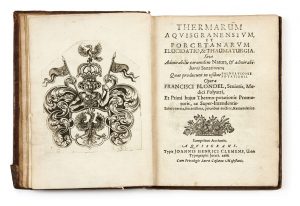 Troisième édition de ce traité du médecin Blondel sur les eaux thermales d’Aix-la-Chapelle, ornée d’un titre-frontispice (ajouté au 1er cahier dans tous les exemplaires), d’un frontispice illustré des armes (rétrospective, à son époque, les armes héraldiques n’étaient pas d’usage), de Charlemagne, une gravure hors-texte des armoiries d’édiles d’Aix-la-Chapelle et Burtscheid, le portrait de Blondel, de nombreuses vignettes in-texte et deux planches repliées, tous gravés sur cuivre. Cet exemplaire contient également son errata, ce qui est rare.