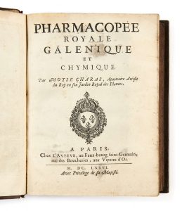 Première édition de cette pharmacopée royale de Charas, comprenant un titre-frontispice, un épître dedicatoire dont le début est également gravé, 6 planches hors-texte et des bandeaux et lettrines gravés sur cuivre.