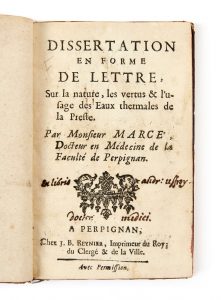 Dr F.X MARCÉ ─ [suivi de :] Raymond RESTAURAND ? - 1627-1682 — Dissertation en forme de lettre sur la nature, les vertus et l’usage des eaux thermales de La Preste ─ [suivi de :] Hippocrates de natura lactis et de usu in curationibus...