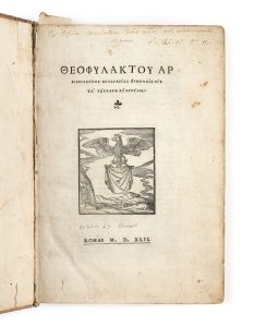 Premiere édition, selon Brunet, en grec des commentaires de Théophylacte d'Ochrid, ornée de la marque de l'imprimeur, Antonio Blado, gravée sur bois sur la page de titre.