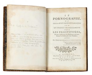 [Nicolas-Edme RÉTIF DE LA BRETONNE] - 1734 - 1806 — Le Pornographe — Londres, Jean Nourse, 1770 — In-8 (20,6 x 12,9 cm), 8, 215 p. (a4, A-N8, O4), veau raciné brun, plats à encadrement de triple filet doré, dos lisse orné, contreplats à...