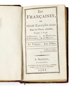 [Nicolas-Edme RÉTIF DE LA BRETONNE] - 1734 - 1806 — Les Françaises Neufchâtel, s.n., 1786 — 4 vol. in-12 (16,8 x 9,7 cm), — •I : 272 p. (A-L12, M2), •II : 312 p. (A-N12), •III : 312 p. (A-N12), IV : 324 p. et [8] f. (A-N12, O6, m8),...