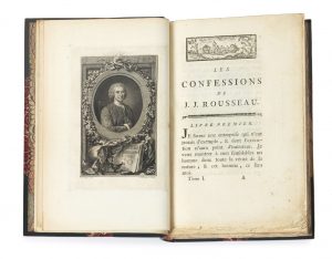 Édition contrefaite de l’année de l’originale des Confessions et des Rêveries du promeneur solitaire, comportant le fleuron à la rose pour les deux 1ers tomes, un portrait de Jean-Jacques Rousseau au 1er volume, ornée de 5 titres gravés à l’eau-forte par Monnet, 1 fac-similé d’une lettre de Rousseau et 102 gravures, parfois en plusieurs états, certaines répétées, par divers graveurs.