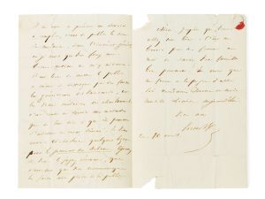Lettre autographe signée de Victor Hugo à Armand Bertin qui entra au Journal des débats en 1820 avant d’en hériter la direction au décès de son père en 1841. Le poète lui annonce la guérison du choléra de son fils par un certain docteur Louis grâce à un remède qu’Hugo considère comme :
