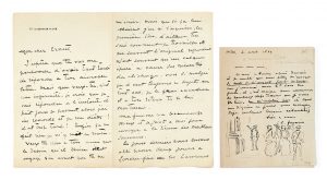 Réunion de 2 lettres autographes signées, dont l’une comporte un dessin original figurant un groupe de personnage.