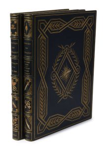 onglet, maroquin bleu nuit, plats ornés de filets dorés et de motifs végétaux mosaïqués et dorés en encadrement d’un médaillon mosaïqué et doré différent sur chaque plat, contreplats à encadrement de même peau orné de dentelle dorée, doublures et gardes de moire pourpre, tranches dorées (H. Prat).