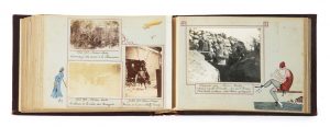 Album comprenant 118 photographies d’époque, légendées à l’encre noire et encadrées à l’encre rouge, orné de petits dessins gouachés, la plupart représentant des soldats, parfois leurs épouses, des paysages ou des trophées dans le goût de Gus Bofa ou Joseph Hémard.
