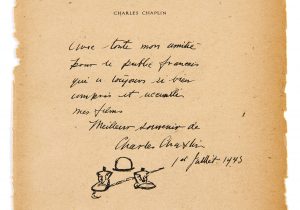Charlie CHAPLIN - 1889 - 1977 — Dédicace autographe, avec un dessin original — [S.l.], 1er juillet 1945 — 1 p. sur 3 f. in-8 (22 x 13,5 cm).