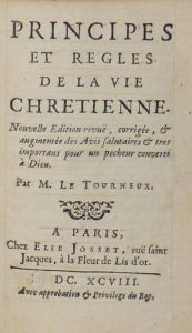 LE TOURNEUX. Principes et règles de la vie chrétienne. Paris, Josset, 1698. Petit in-12 (125 x 85 cm), maroquin rouge janséniste, doublures de maroquin rouge ornées d'une large dentelle droite "au tournesol", tranches dorées sur marbrure...