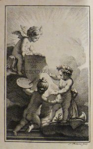 Fronstispice gravé par Folkema, 5 bandeaux dont 4 figurent des amours peintres, 8 médaillons de portraits des grands peintres et 2 figures au trait.