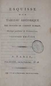 CONDORCET (Jean-Antoine-Nicolas Caritat de). Esquisse d'un tableau historique des progrès de l'esprit humain. Ouvrage posthume. Seconde édition. Paris, Agasse, An III (1795). In-8, cartonnage papier bleu, pièce de titre (Reliure de l'époque).