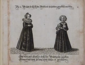 Suite de 33 planches (sur 40) de costumes populaires, de la bourgeoisie et de la noblesse de Nuremberg au XVIIe siècle, gravées sur cuivre par H. J. Schollenberger et N. Haüblin.