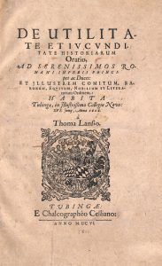 LANSIUS (Thomas). De utilitate et jucundidate historiarum oratio. Tübingen, Cellius, 1606. In-folio de 20 ff., bradel cartonnage de papier décoré, dos lisse, titre en long (Reliure de l'époque).