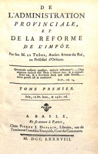 LE TROSNE (Guillaume-François). De l'Administration provinciale, et de la Réforme de l'impôt. Bâle ; Paris, Pierre J. Duplain, 1788. 2 volumes in-8, demi-basane brune, dos orné (Reliure de l'époque).
