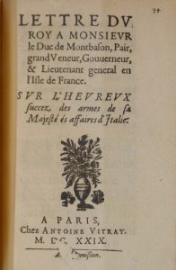 [LOUIS XIII]. Lettre du Roy à Monsieur le Duc de Montbason, Pair, grand Veneur, Gouverneur et Lieutenant genéral en l'Isle de France. Sur l'heureux succez des armes de Sa Majesté és affaires d'Italie. Paris, Antoine Vitray, 1629. Petit in-8 de 12...